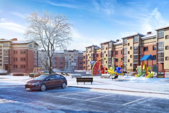 На основе генплана Студия подготовила несколько вариантов визуализаций в летнее и зимнее время. Для отображения всего комплекса зданий был выбран теплый сезон, для внутренней территории – улиц и прогулочных зон – холодный, чтобы акцентировать внимание на строениях.