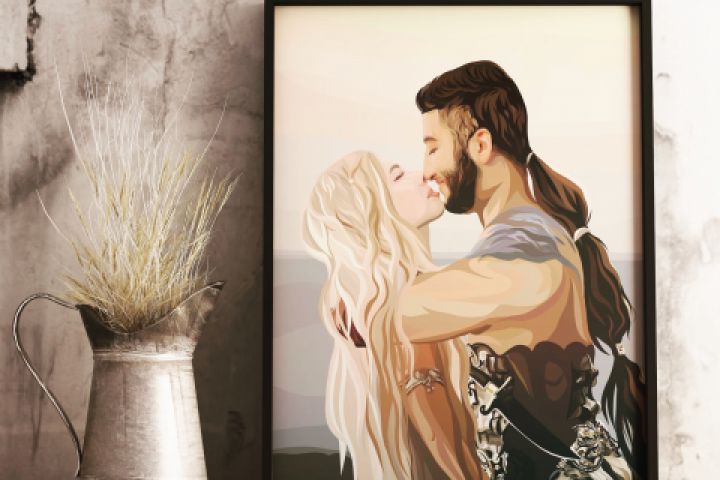 Нарисованы двое влюблённых в костюмах и прическах героев киносериала «Игра престолов» : Дейнерис Таргариен и Кхал Дрого. Портрет выполнен в векторной графике. Для создания представленной работы использовался планшет IPad Pro и Apple Pencil. Программы для рисования: Adobe Illustrator Draw.