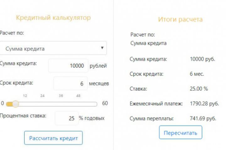 Виджет для сайта. Расчет кредита по сумме, ежемесячному платежу или доходу. Реализовано на JavaScript, с использованием jQuery. Верстка на Bootstrap.
