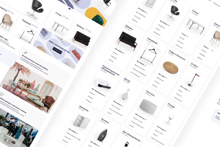 Дизайн сервиса по аренде мебели и аксессуаров для мероприятий​ Кенго. Разработка стилистики, 4 варианта адаптивов с упором на мобильную версию. Всего около 60 макетов с UI kit и подготовкой к верстке.