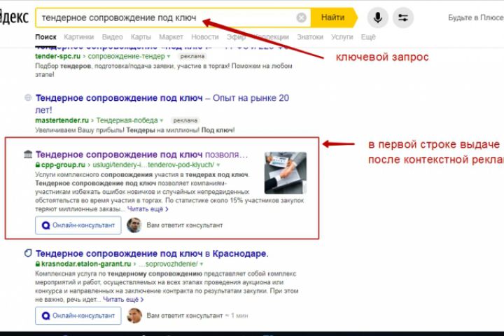В скриншоте показан пример результата поискового продвижения сайта ЦПП ( компания занимается юридическим сопровождением бизнеса: тендерным сопровождением под ключ, подготовкой документации, предоставлением базы с контрактами. )
