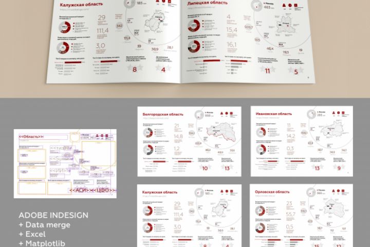 Дизайн и верстка карточки региона. Было важно автоматизировать процесс для исключения ошибки в данных. Данные занесены в файл эксель. Ссылки на графики (построены при помощи библиотеки matplotlib, pandas) также.