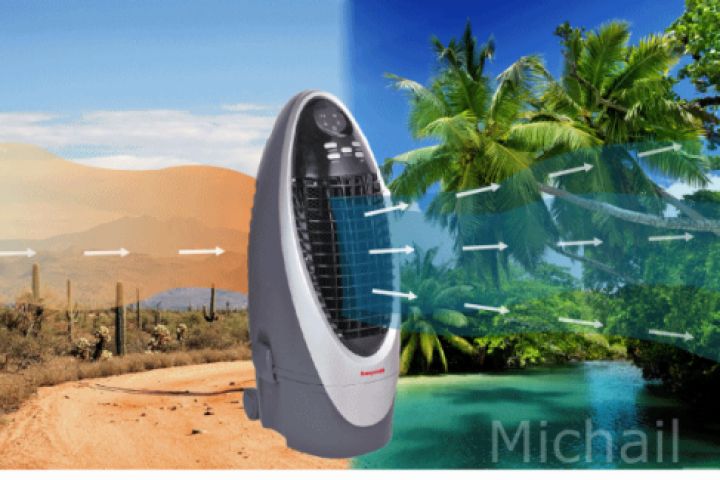 Одной фирме понадобилось изображение, в котором бы отображалась работа увлажнителя воздуха. Контактное лицо, Владимир, объяснял мне множество технических подробностей. Я подумал, что все они не уместятся на картинке, и, без сомнения, только её испортят. Я предложил Владимиру свой вариант: увлажнитель воздуха превращает пустыню в оазис. Идея получила одобрение, и вскоре для их сайта я сделал вот такую гифку