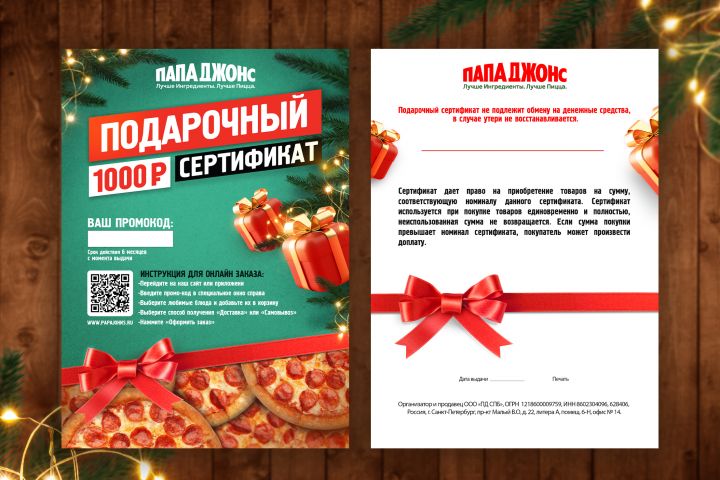 Новогодний подарочный сертификат для пиццерии "Папа Джонс"