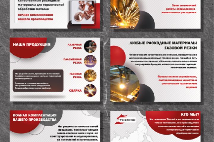 Презентация из 6-ти слайдов выполненных в единой тематике для компании "THERMEI", которая производит составляющие для лазерной резки.