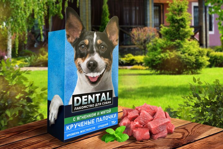 Упаковка для лакомства собак- крученые палочки с ягненком и мятой. Фирма "Dental"