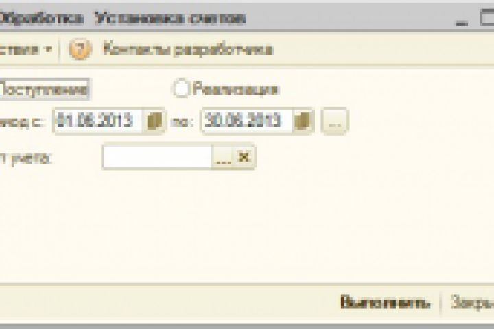 Обработка "Установка счетов" для конфигурации 1С:"Бухгалтерия предприятия 2.0". Обработка устанавливает счета учета в документах "Реализация товаров и услуг" и "Поступление товаров и услуг" в соответствии с настройками обработки.
