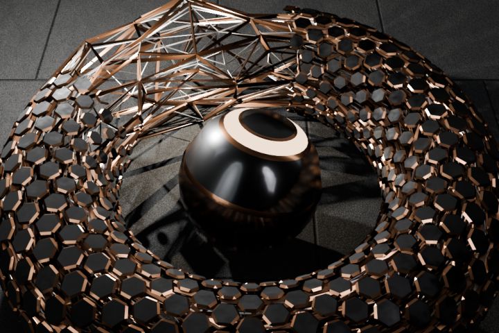 An abstract 3D model inspired by cosmic forms. The black background with golden accents creates depth and mystery. Unique music composed specifically for this model enhances its exclusivity.