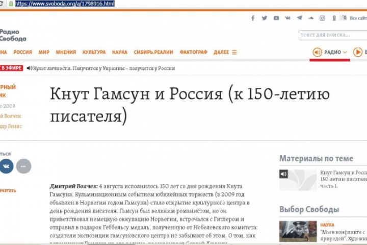 Мое интервью на радио "Свобода" к 150-летию Гамсуна