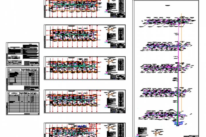 На изображение общий вид готового проекта системы кондиционирования, включающий в себя листы: общие данные, план каждого этажа, с указанием расположения кондиционеров, фреонопроводов, аксонометрическая схема системы кондиционирования, спецификация оборудования