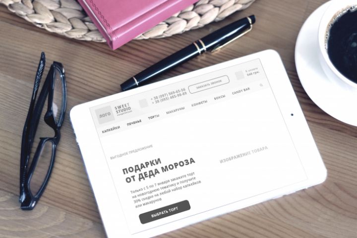Прототип сайта (планшетная версия) под ключ с легким и нежным дизайном для кондитерского дома Sweet Studio