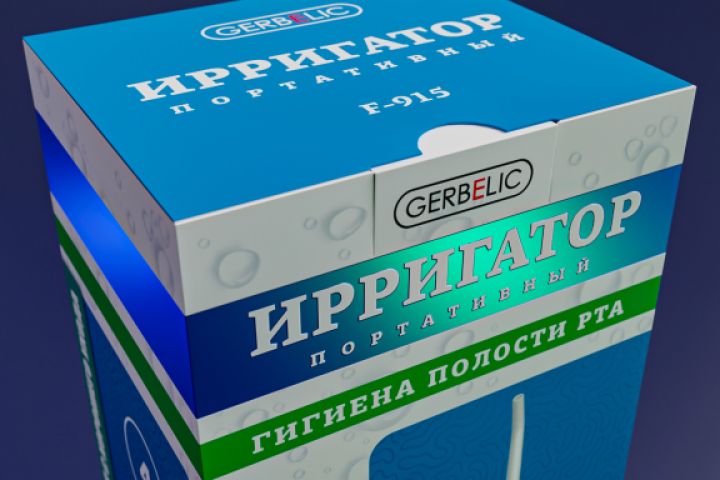 Упаковка для ирригатора. Особенность упаковки в том, что при печати используется фольгирование и выборочная лакировка.