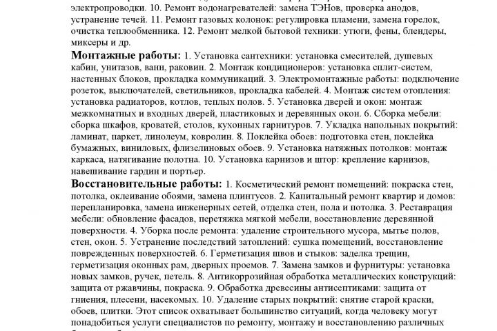 Клиент попросил составить список всех бытовых потребностей человека касаемо обращения к ремонту бытовой техники, к монтажным работам, восстановительным работам.