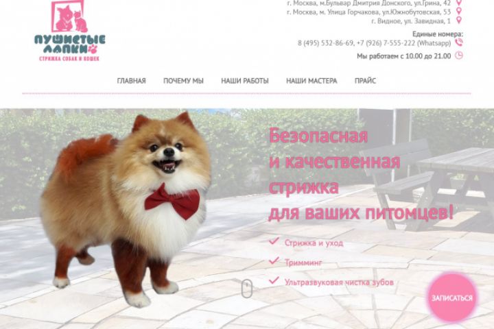 Зоосалон из Москвы «Пушистые лапки» заказал легкий лендинг в серо-розовых цветах. В результате получился атмосферный одностраничник, удобно работающий как на телефонах, так и на широкоформатных мониторах. Представлена вся необходимая информация - описание услуг, преимущества салона, краткий рассказ о мастерах, цены. Посетитель сайта может записать своего питомца на стрижку в любую секунду, воспользовавшись "прилипшей" кнопкой вызова почтовой формы.