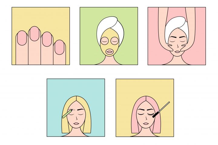 Иконки для студии красоты. Каждая иконка создана для разных видов услуг: маникюр, процедуры по уходу за лицом, массаж, процедуры для бровей, процедуры для ресниц.
