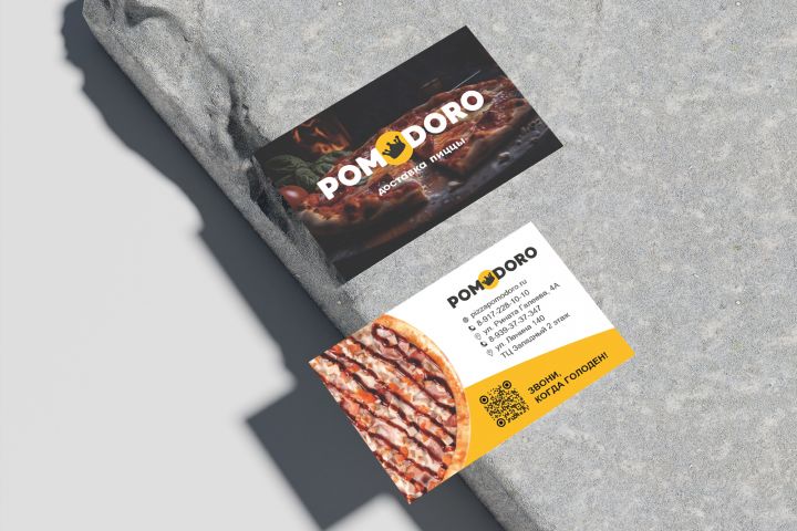 Помодоро - сеть итальянских пиццерий. Для них созданы визитки, плакат на входную зону, уголок потребителя.
