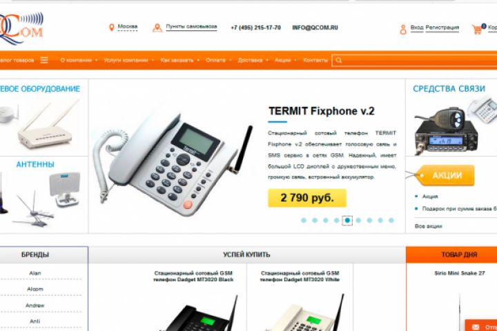 Интернет-магазин по продаже оборудования телекоммуникации, усилителей сотовой связи, стационарных сотовых телефонов, WiFi оборудования и др. На сайте реализован геотаргетинг, удобная форма заказов, выбор пункта самовывоза.