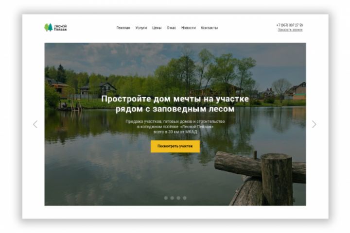 Лендинг для компании "Лесной Пейзаж" представля.щий её посёлок и продающий услуги компании: продажа участков,дома и строительство домов на террритории посёлка.