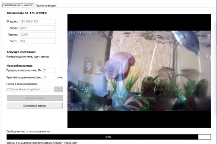 Программа позволяет принимать видео с IP-видеокамеры, сохранять его, разбивая на файлы-отрывки. Имеется возможность указать папку с файлами на ПК для видео, а также указать предел ее размера. Также можно просматривать полученный видео-архив, имеется возможность поиска фрагмента по дате и времени.