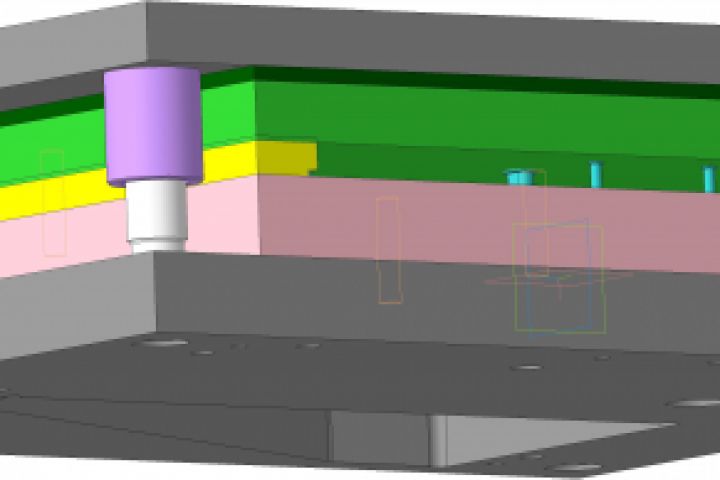 Последовательный штамп для пробивки отверстия и вырубки треугольного кронштейна. В штампе реализована система ловителя для штамповки из ленты