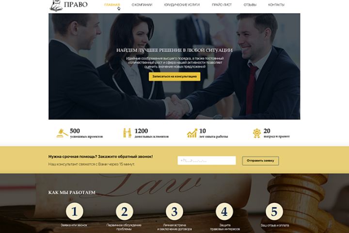 Дизайн главной страницы юридической фирмы "Право", представляющей юридические услуги физическим и юридическим лицам.
