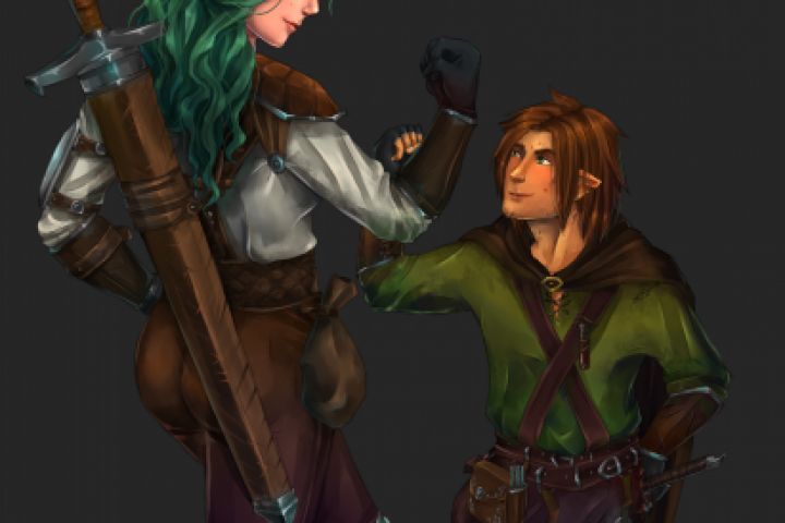 Два любимейших персонажа по собственному проекту (пока еще не законченная книга, что пишется с подругой), эльфийка-мечница Сайори и полурослик-плут Калеб.