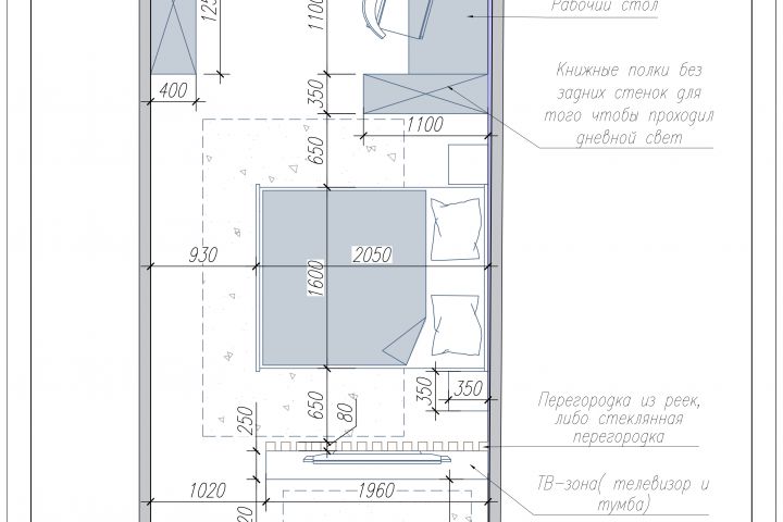 Необходимо было выполнить планировку комнаты с 3 зонами: Спальная зона, рабочая зона и зона отдыха