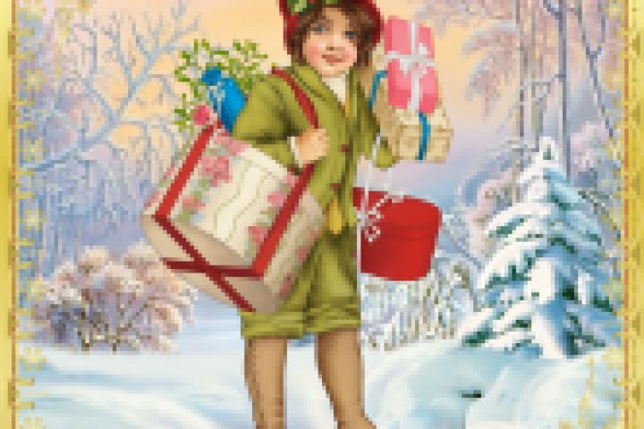 Мальчик и новогодние подарки. Иллюстрация для новогодней упаковки в ретро стиле.