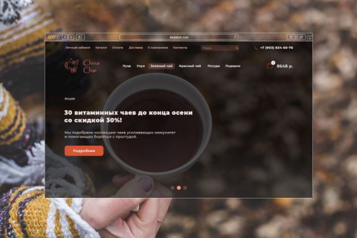 Дизайн лэндинга магазина китайского чая выполнен в постельных тонах, ставилось задачей передать уютную атмосферу осеннего чаепития.