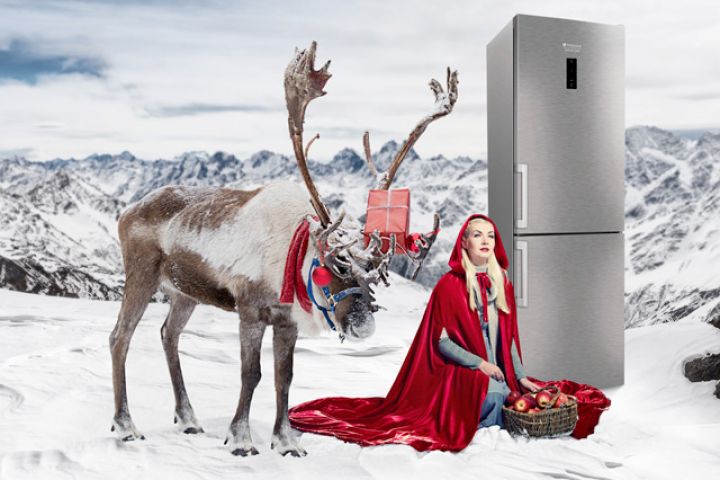 Ключевая рекламная визуализация холодильников Hotpoint Ariston. Hotpoint позволяет сохранить свежесть ваших продуктов надолго: датчики точного контроля и поддержания температуры, отделение для свежих фруктов и овощей Ultra Fresh Crisper, систему озонирования Active Oxygen и зону «3 в 1».