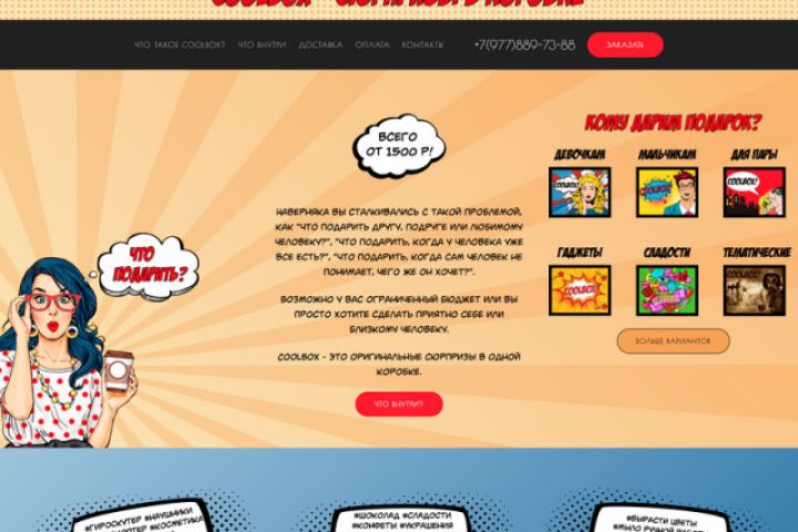 Адаптивный лэндинг в стиле комикс и поп-арт на базе WordPress и YooThemes Pro. Онлайн-чат, форма заказа с выбором различных вариантов коробок. Адаптированное перерасположение контента для мобильной и компьютерной версии.