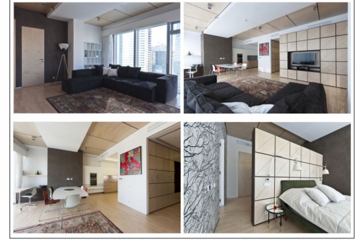Апартаменты площадью 103 м2 с панорамным остеклением, на этаже башни «Москва» с видом на… недостроенный небоскрёб. Исходная планировка была очень рациональна, близка к идеалу. Я лишь внес небольшие изменения, увеличив жилые комнаты за счет остальных помещений. Основная идея – сделать интерьер двойного назначения, что бы его можно было использовать и как жилой и как небольшой офис. В оформлении интерьера использовано много натурального дерева, богатая текстура которого является противовесом урбанистической атмосфере сити.