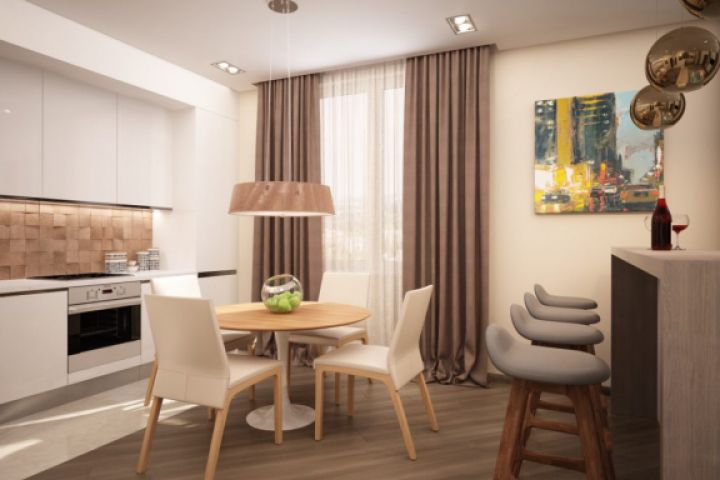 Интерьер двухкомнатной квартиры в ЖК Мичуринский выполнен в современном стиле в светлых тонах. Акценты в этом интерьере идут на фактуры — сочетание камня и дерева с глянцем розового золота в подвесах. Особой задачей в проектировании планировочного решения было было создание целостного пространства кухни-гостинной без лишних перегородок с выделением небольшой, так называемой гостевой зоны, с отдельным раскладными диваном.