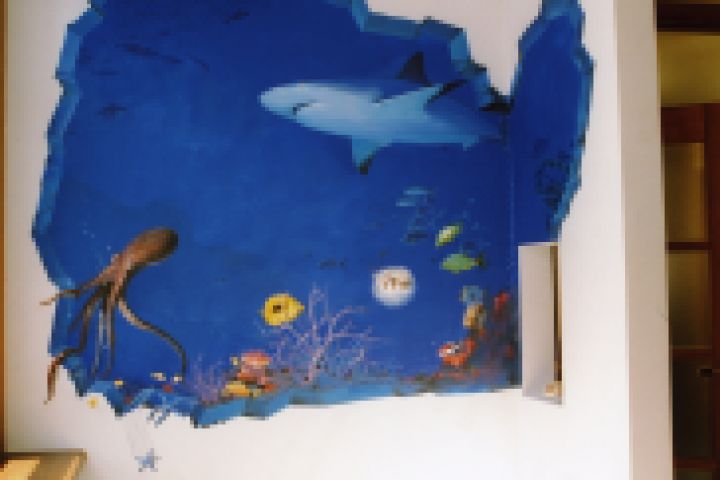Оформление области стены для большого морского аквариума. Работа выполнена акриловыми красками по финишной шпатлёвке.