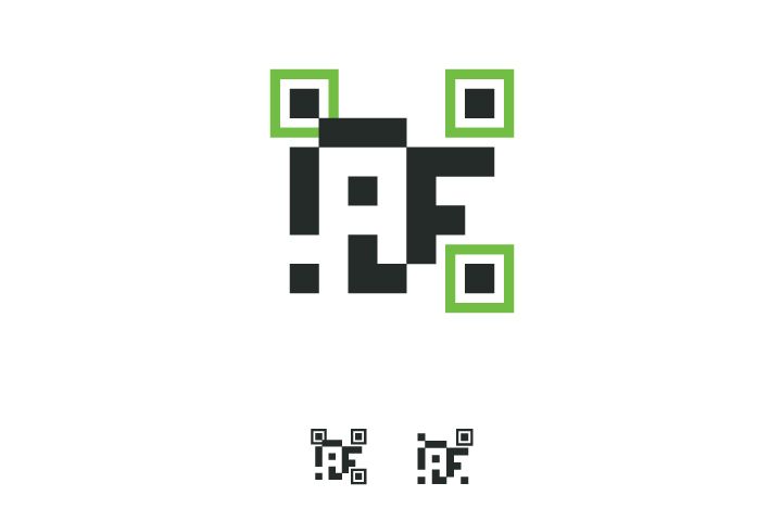 в знаке читаются буквы A, F. Знак ассоциируется с QR-кодом, знак вписан в квадрат, построен по сетке и по пропорциям. Статичный логотип. Пиксельный стиль. Знак можно использовать в двух вариантах. В логотипе сочетаются два цвета. В логотипе используется свободный шрифт Raleway