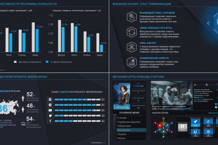 Презентация такого типа очень требовательная к условиям представления (освещение комнаты или аудитории и тип экрана) и к наполнению (подбор цветов и большой размера шрифта), однако выделяет проект на фоне конкурентов и гарантированно производит впечатление на слушателей