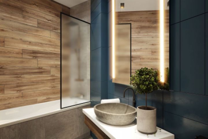 Сочетание дерева и насыщенного синего цвета. Минимум элементов снаружи, максимум функциональности.