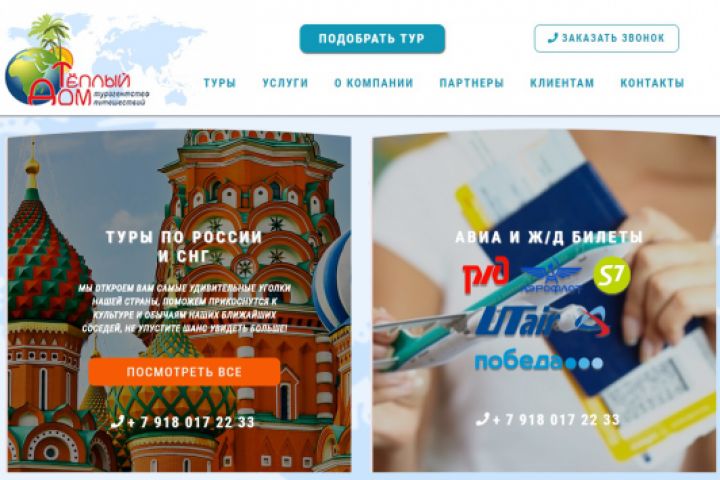 Редизай главной страницы сайта, туристической компании. Использование Bootstrap, Gulp, SCSS, Jquery, HTML5, CSS3, PHP, JS. Desktop, планшет и мобильная версия.