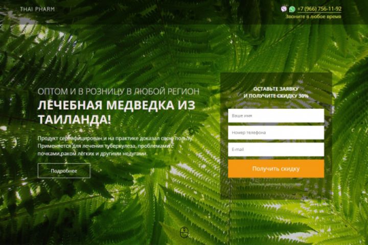 Яркиий Landing-Page разработан для компании Thai Pharm, прост и удобен для пользователя. Использование Bootstrap, Gulp, SCSS, Jquery, HTML5, CSS3, PHP, JS. Форма отправки данных, PHP. Desktop, планшет и мобильная версия.
