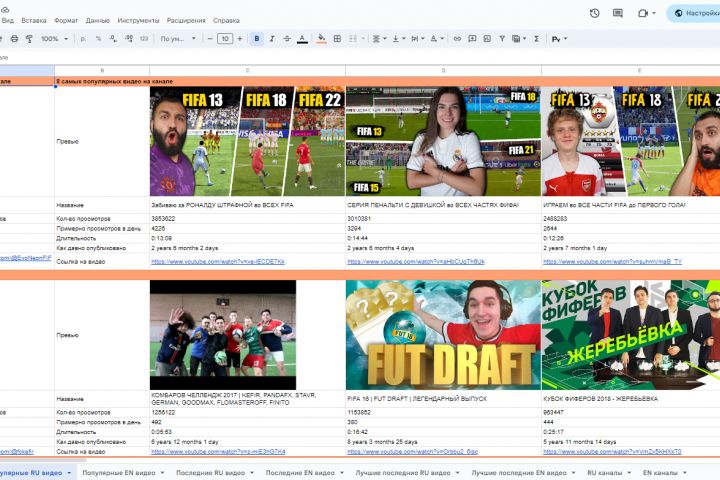 Это самое важное и полезное. Вы буквально можете зайти на этот лист и узнать, что Вам стоит снять. Именно здесь будут собираться самые быстрорастущие, трендовые видео на данный момент в Вашей нише