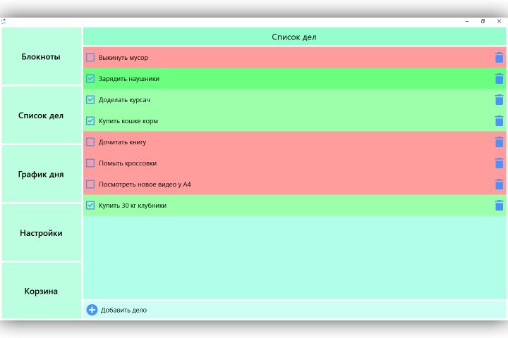 В настройках есть 3 настройки: наличие красного фона у невыполненных дел, наличие зелёного фона у выполненных дел, запускаемое окно по умолчанию (либо блокноты, либо список дел, либо график дня)