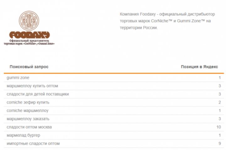 Давний и любимый клиент, работаем и по сей день. Срез позиций.