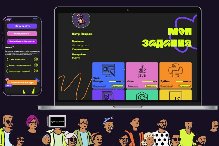 - Уникальный дизайн с акцентом на неоновые цвета и элементы геймификации.