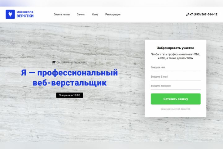 Верстка сайта-лендинга школы профессионального верстальщика. В работе применены следующие технологии: 1. Верстка HTML5 по БЭМ, CSS3; 2. Сверстано по Pixel Perfect; 3. Интегрирован JS и JQuery;