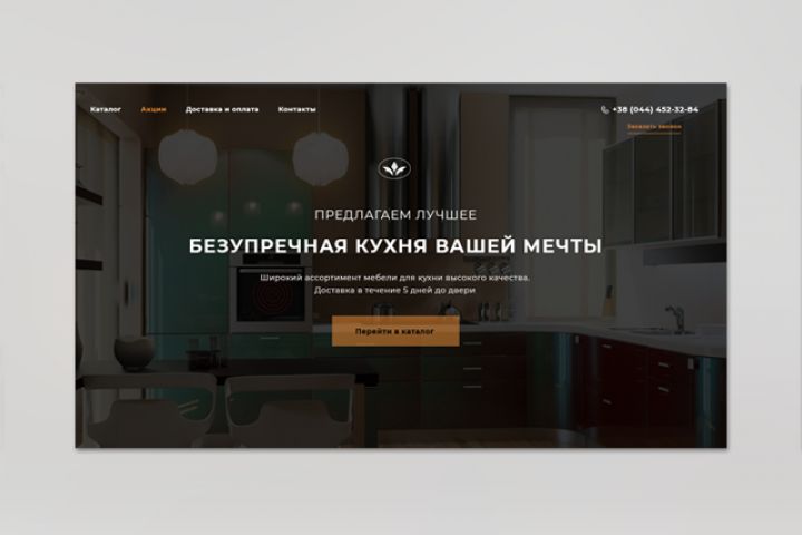 Дизайн первого экрана лендинга интернет-магазина "Кора". Продажа мебели для кухни