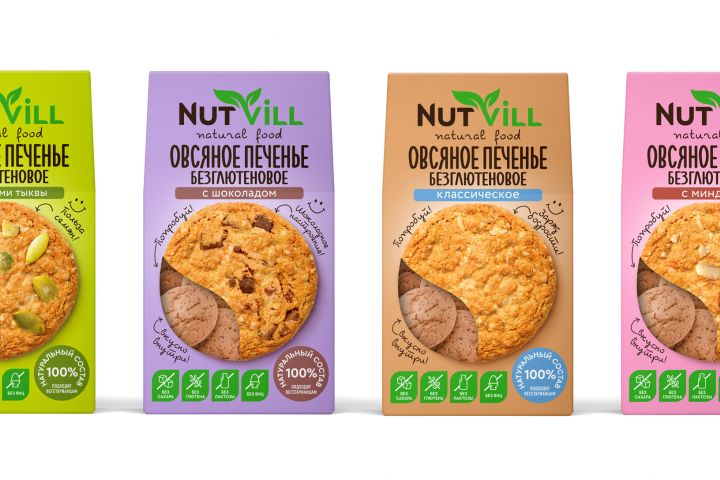 Разработали дизайн упаковки очередного вкусного и полезного продукта — безглютенового печенья «NutVill». Дизайн выполнили в традиционно яркой, привлекательной, «аппетитной» стилистике бренда.