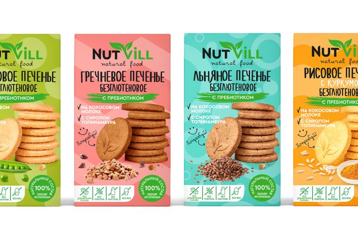 Разработали дизайн упаковки очередного вкусного и полезного продукта — безглютенового печенья «NutVill». Дизайн выполнили в традиционно яркой, привлекательной, «аппетитной» стилистике бренда.