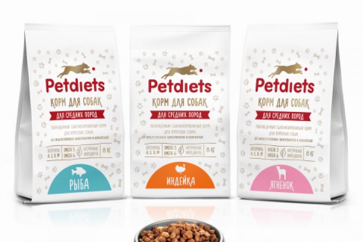 В дизайне упаковки корма для собак Petdiets мы обошлись без изображения животных, но добавили забавный паттерн из лапок и косточек. Упаковка содержит ясную и понятную для владельца питомца информацию о корме, его составе, питательной ценности, рекомендуемых порциях и тд. Крупный цветовой дифференциатор указывает на вкус корма в упаковке.