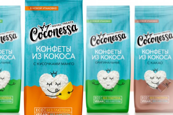 Для дизайна упаковки линейки кокосовых конфет мы придумали в качестве центрального персонажа веселую конфетку «Coconessa», которая ведет активный и здоровый образ жизни, но при этом никогда не откажется от фруктов и сладостей!