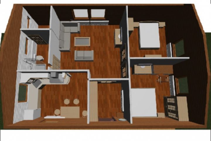 3d вид (НЕ визуализация) планировки дома с расстановкой мебели. Необходим на начальных стадиях разработки дизайн-проекта для понимания расположения мебели и оборудования.